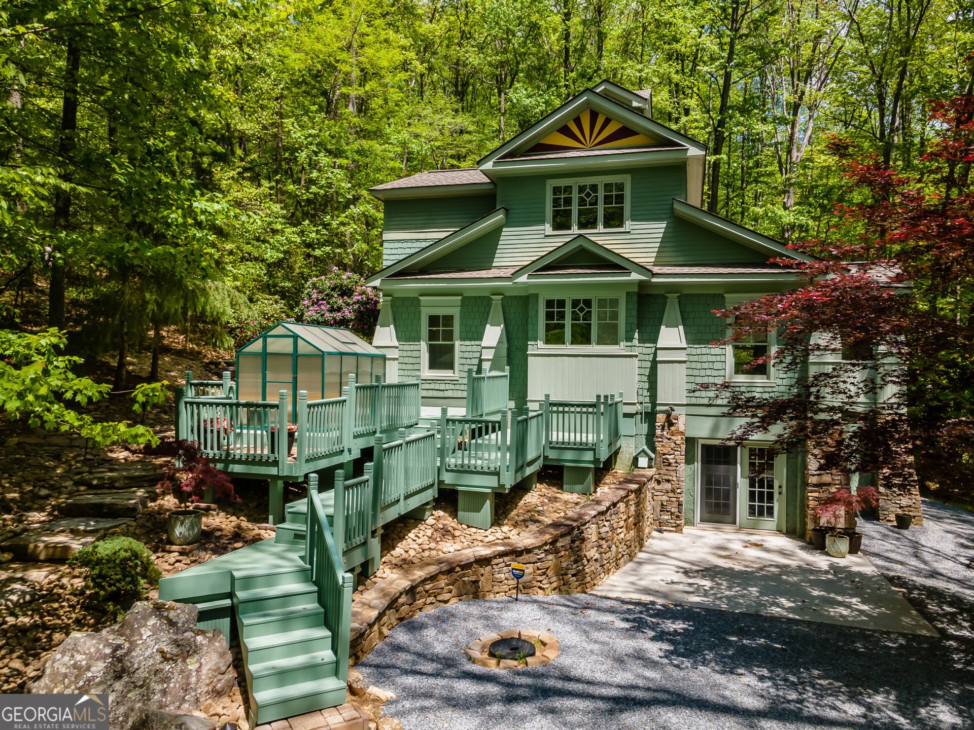 This uniquely custom 3BR/3BA home with USFS and CREEK frontage features high-end finishes throughout, including new hardwood and porcelain flooring, neutral paint, and distinctive architectural details such as a hand-laid stone fireplace, a windowed tower with exposed beams, antique schoolhouse doors, and a steel circular staircase. The custom kitchen is equipped with maple cabinetry and a copper sink. The versatile three-room upstairs primary suite offers premium bathroom fixtures, including double vanities with apron sinks, Italian porcelain, and a custom-controlled shower. This level also includes three floored attic storage spaces, a tower w/exposed beams and a ton of natural light. Additionally, the daylight basement serves as an ideal in-law suite w/ a full custom kitchen, front and back exterior entries, a bedroom, office, living room, and a full bathroom featuring pedestal sinks, a clawfoot tub, and an in-ground faucet bidet. Modern infrastructure for the property includes a comprehensive security camera network, a three-zone dual-fuel HVAC system, a generator, and both electric and manual backup well pumps. The exterior is designed for both luxury and utility, boasting a 300-square-foot treehouse screened porch with a hot tub, four decks, a greenhouse, and professional landscaping with hand-laid stone walls. The estate spans approximately thirteen acres of hardwood forest across two lots-offering subdivision potential-and borders national forest land. It is located just a short drive from the Noontootla River, Toccoa River, and Springer Mountain/Appalachian Trail. This property can be purchased with an adjoining 4.76 acre horse farm for a total of 17.38 acres! SEE MLS #